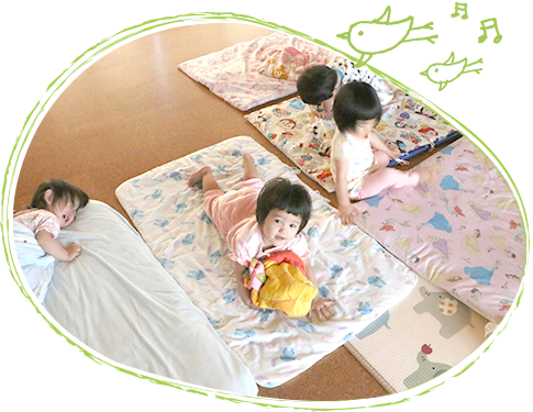 0歳児 7:30~ 登園・視診 9:00 おやつ 9:30 自由あそび 10:30 昼食、着替え、絵本の読み聞かせ 11:30 お昼寝 14:45 目覚め 15:00 おやつ、着替え、自由遊び、順次降園 0歳児用施設について詳しく見る